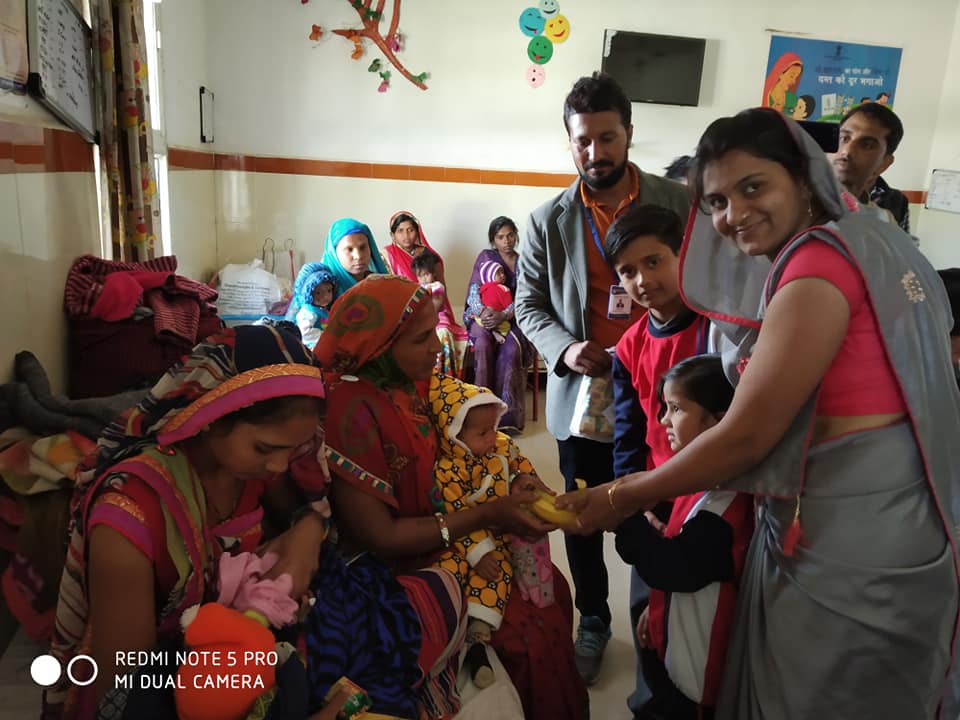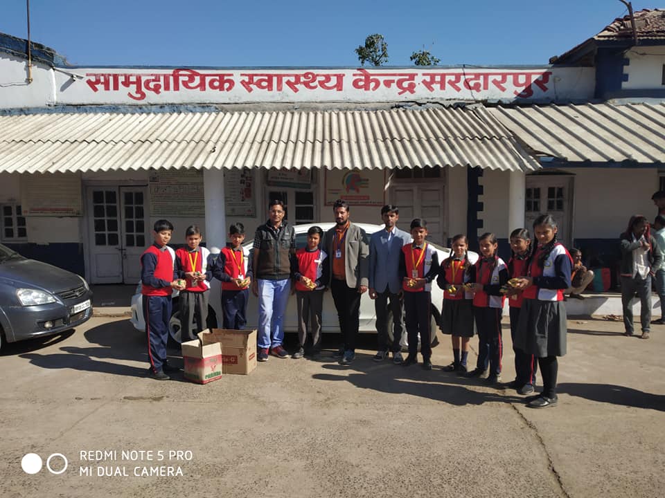 BMO Sardarpur, Dr. Sheela Mujalde, explained about malnutrition and nutrients to students of LCS Rajgarh, during which students distributed fruits and biscuits to malnourished children present in the Nutrition Rehabilitation Center.