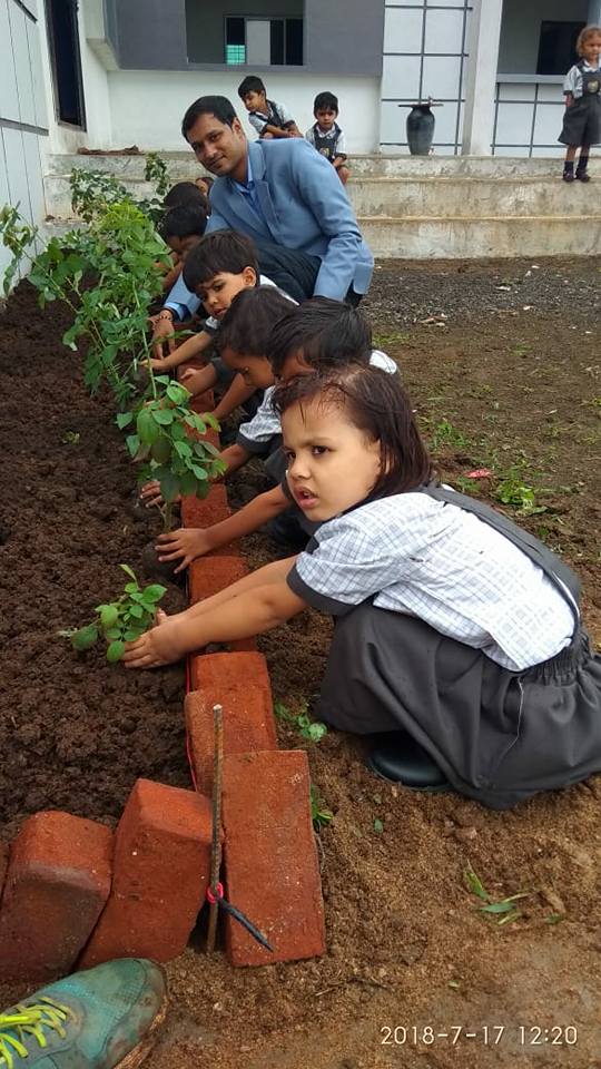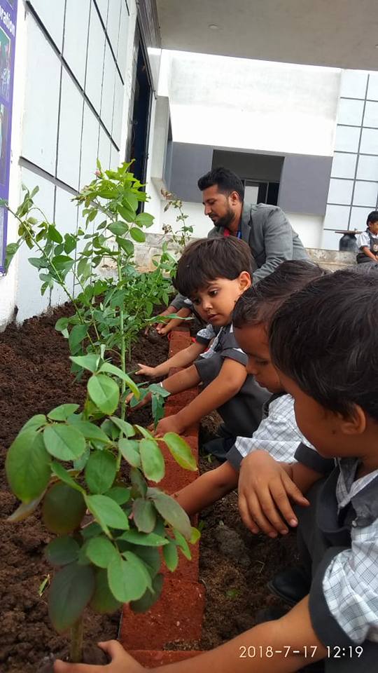 The Tree Plantation Drive began with students gathering in the ground. In the spirit of the day, they had brought small little saplings to be planted in school ground. The gardener helped them plant their trees. All the students were very enthusiastic and thoroughly enjoyed the planting process, even though they all got wet and muddy – they loved it.